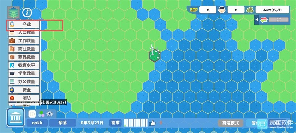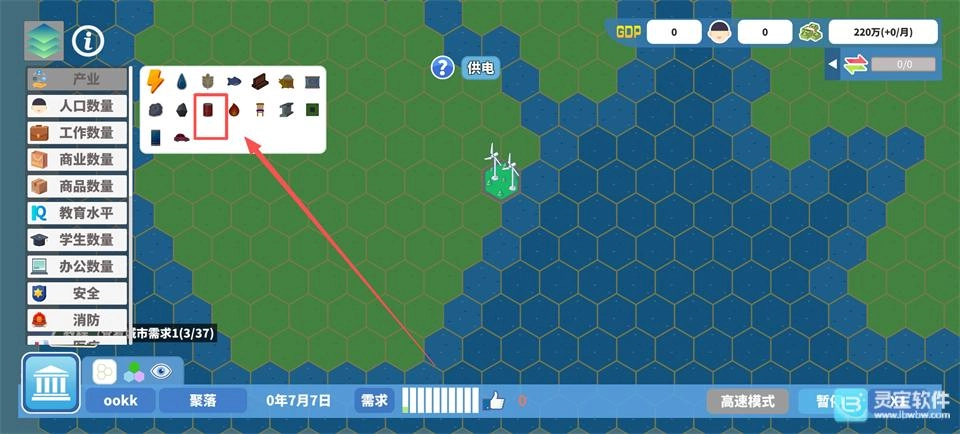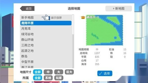 进入游戏后点击“新游戏”开启城市经营之旅,在地图列表中挑选符合规划方向的区域,点击左上角绿色图标,选择【产业】并点击【石油】,地图上出现的绿色地块即为油井建造位置。
