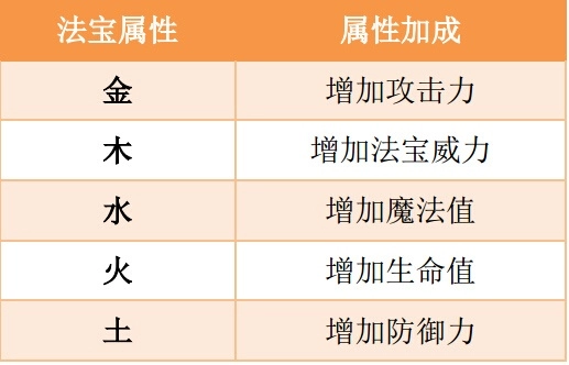 目前,法宝的属性分为5类:分别为金、木、水、火、土。