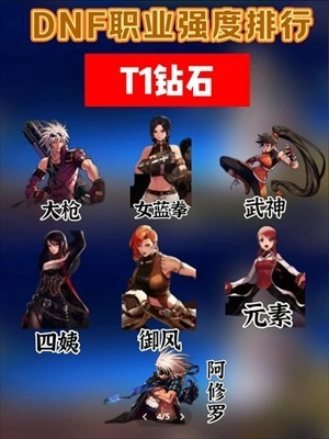 剑宗、狂战士、莽荒为T0,大枪、女蓝拳、武神、四姨、御风、元素、阿修罗为T1,暗枪、团长、气功、奶爸、奶妈、奶萝、暗帝、剑豪、蓝拳为T2,关羽、女大枪、神女、剑魔、女漫游、战法、弹药为T3,机械、剑魂、魔道、鬼泣、男漫游为下水道。