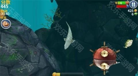 4、鲨鱼看见石头里面的一个大球不要碰,会被炸死。