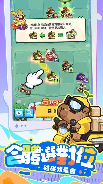 2、【合体选对位,碰碰我最会】召唤单位随机登场,融合自走棋玩法,动态布局搭配合成升级,拼运气更拼战术,布阵制胜不是梦!