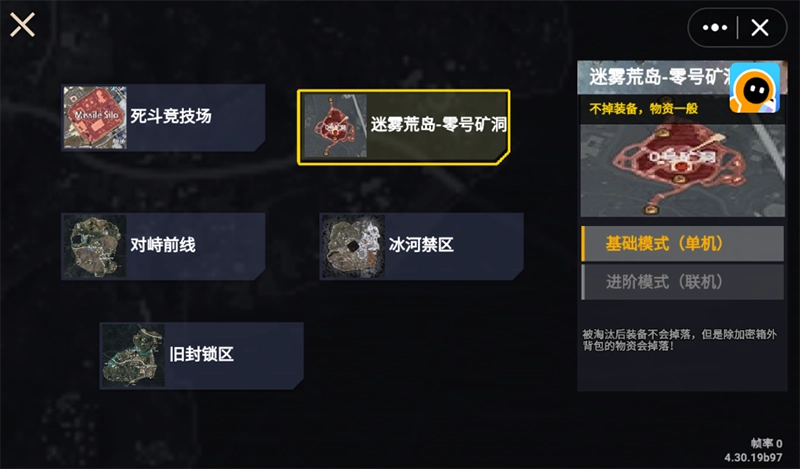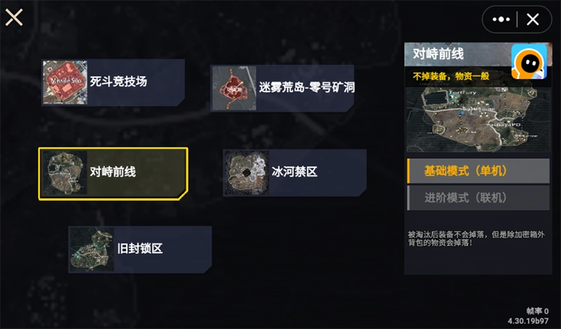 死斗竞技场进阶模式概率掉装、物资丰富,战备价值400000;迷雾荒岛-零号矿洞基础模式不掉装备、物资一般,进阶模式概率掉装、物资丰富,战备价值500000;对峙前线基础模式不掉装备、物资一般,进阶模式概率掉装、物资丰富,战备价值50000;冰河禁区基础模式不掉装备、物资一般,进阶模式概率掉装、物资丰富,战备价值350000;旧封锁区基础模式不掉装备、物资一般,进阶模式概率掉装、物资丰富,战备价值300000。