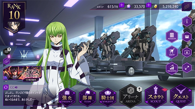 KMF的放置分明与暗的实时战斗系统具有高度战略性,玩家可像鲁路修一样安排战斗,3D形式呈现的高品质作品让战斗更精彩,游戏中有许多角色和Knightmare Frame,玩家可训练角色骑乘Nightmare并从众多选项中建立自己的最强单位。