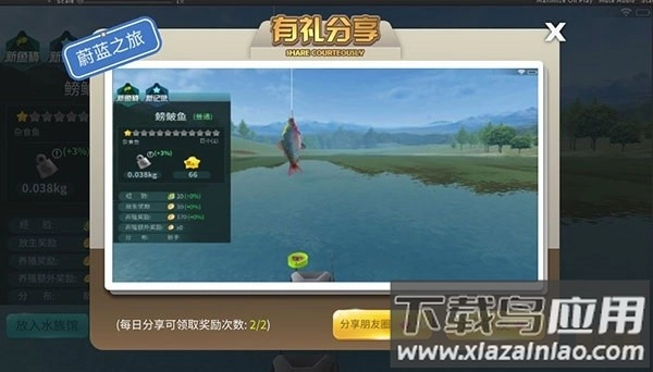 2、上鱼拍照:溜鱼成功后可点击拍照,每日可分享两次;分享至朋友圈可获得10点体力,分享给好友可获得5点体力。