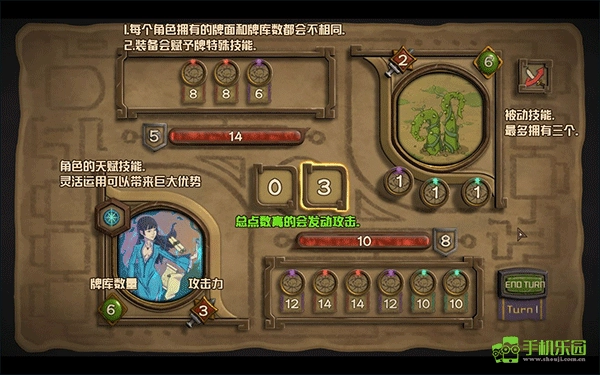 玩家需要思考的是,通过计算双方的手牌与牌库内容,合理运用不同技能资源来争取胜利。要注意的是,持续攻击并非唯一的获胜方式,游戏里还存在多种能让敌人自食其果的手段(比如反击伤害、疲劳伤害等)。
