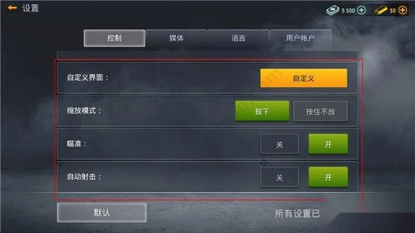 4、在“设置”页面的“控制”选项里,能够对界面、缩放模式、瞄准、射击等各项功能进行设置。