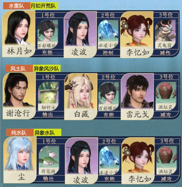 李逍遥是版本强力主C,高额倍率且与灵儿有组合技;灵儿是通用辅助万金油,大招加攻击、水系回转快、buff覆盖率高且能衔接控制;林月如是保值破条手,配合大招强化buff可当主C;李忆如0命即完全体,奶量随生命提升,打本必带;凌波是4星副C,后台挂水召唤水环;尘开荒伤害略低于逍遥,成型后与逍遥55开且两者都吃命座;白藏是土系聚怪角色但大招能量缺口大;谢沧行大招锁血、命中敌人回血且技能带缴械,爆发高但真空期长;王小虎数值尚可,与李忆如有组合技;雷元戈是套盾手,就业空间为保谢沧行真空期;风主数值技能正常,适合度过前期;花花在没有李忆如时可带;龙溟聚怪范围频率低,输出和副C定位尴尬;易策数值低,强度不如主角和小虎;云瑞草被林月如压制,正常队伍很少带。