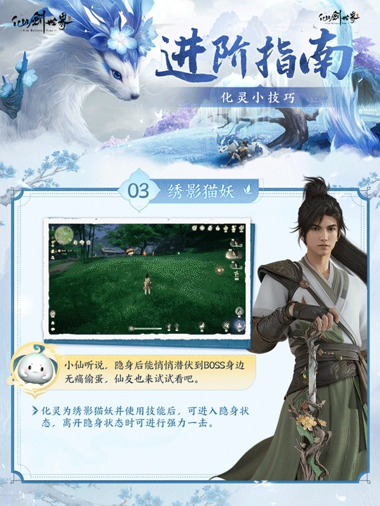 小仙锦囊:在搜寻灵茧时,化灵绣影猫妖,使用【隐身一刀】进入隐身状态,可避开灵茧附近的精怪,直接拾取灵茧!