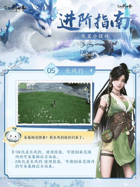 小仙锦囊:当你还在苦恼附近采集物太多,逐个拾取太麻烦时。小仙为您献上一计,化灵为长风豹使用技能,附近的采集物将被一键收入囊中,一键解锁大量资源涌入背包的快乐!