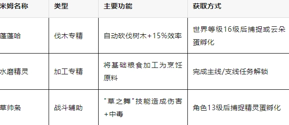 游戏里的宠物/伙伴系统对资源获取起着关键作用。各类米姆有着不同的专精加成,比如蓬蓬哈能让木材采集效率提高15%,桃桃猴可使挖矿速度加快20%,蓝蓝鼠则能提升12%的浇水效率。在游戏前期,推荐优先入手这三只功能性米姆,它们能显著提升资源获取的效率。其中蓬蓬哈是通过剧情赠送的,捕捉率为100%;桃桃猴在树野岛瀑布后的隐藏位置,需要用滑翔伞二段跳来触发;蓝蓝鼠在云海区彩虹桥的左侧,带上3颗糖果可以增加好感度。
