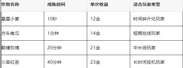 玩家需要通过采集木材与矿石、种植农作物以及探索特殊物品来获取基础资源,之后利用这些资源开展加工、建造与交易活动。需要注意的是,游戏里的资源存在时间价值上的差异——部分资源能快速获得但价值不高,另一些则需要长时间等待却能带来丰厚回报。比如星星小麦仅需10秒就能收获,单次可获得12金;而火苗红茶需要40分钟才能成熟,单次收益却能达到23金。合理安排资源获取的节奏,是实现高效游戏的关键所在。