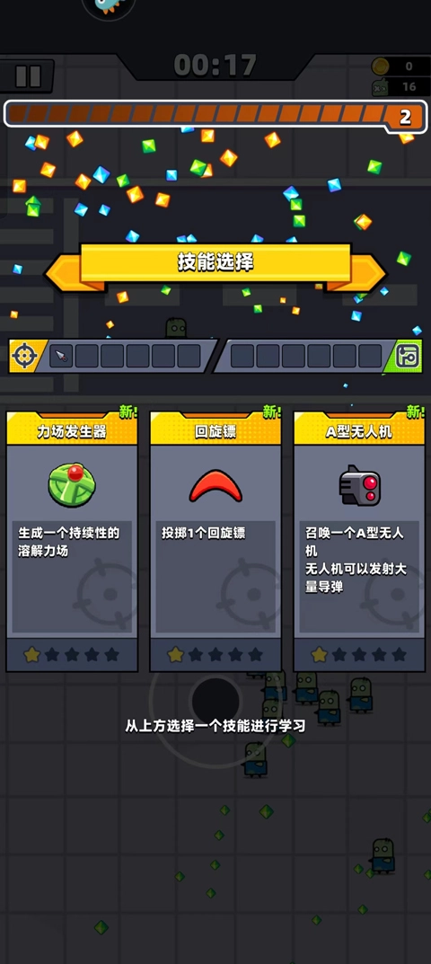 4、拾取地上的钻石可以更加快速的提升等级,每提升一个等级就可以学习一个技能;