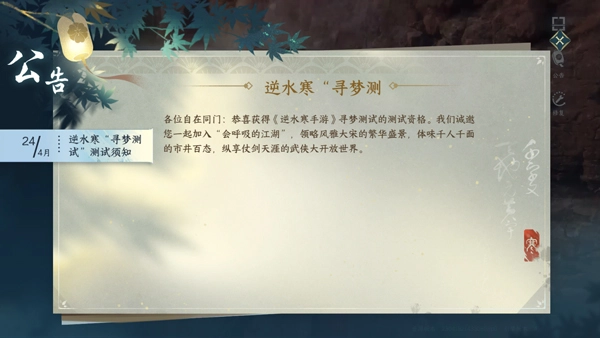 逆水寒寻梦测试于4月28日10:30开服至5月11日24点关服,为限量计费删档测试,支持苹果、安卓大部分机型及模拟器且数据互通,需用激活码激活网易通行证,iOS通过TestFlight推送、安卓及模拟器通过专题站或二维码安装,安装需卸载旧包体(iOS还需停止上次测试资格),仅能在手机端创角,iOS暂不支持手机端付费需前往充值中心,安卓可在手机端或充值中心付费。