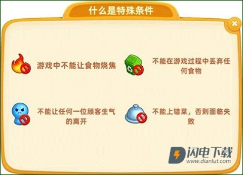 关卡中可能会有一些特殊条件,比如不能烧焦、不能上错菜等,这些会在进入关卡时有特别说明。若触发了这些条件,挑战就会失败,所以可千万要小心。