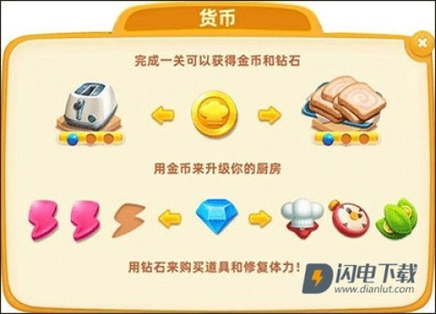 1、金币:在通关时获得的金币可用于升级设备和食材,提高你的生产力。