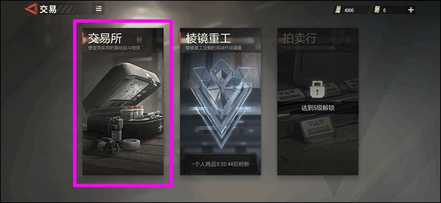 2、在交易界面找到并点击“交易所”功能选项,或者玩家也可以在升级到五级后开启拍卖行功能;
