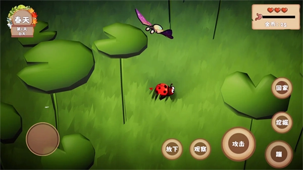 1、这款游戏采用第一人称视角来模拟昆虫的生存状态,玩家需要操控一只小型节肢动物在自然环境里完成各项生存挑战,主线任务的时间周期设定为持续12个游戏日。