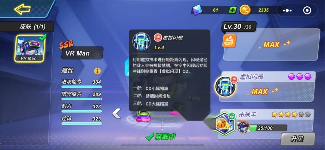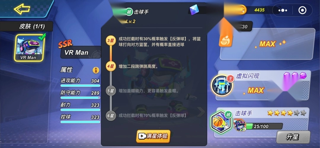 VR Man一定要升级到四星再拿出来打,可以先用别的角色打资源去养VR Man。不然反弹球是没有什么用的,因为跳的高度不够,是根本打不到对面投出来的球。