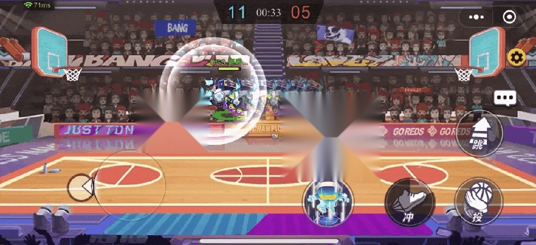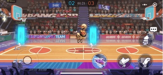如果我们拿到了球,对手距离非常近,我们离球框还比较远时就可以跳起来用【虚拟闪现】+【冲】,瞬间到达篮筐扣篮。