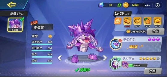 SSR角色寄居蟹非常灵活,技能十分有特色,可以变小身型快速移动,随时随地发起猛烈一击。