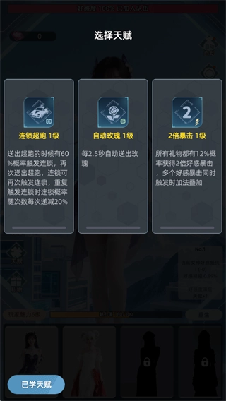 独特好感度系统,通过互动提升与女神关系,解锁加入与技能。