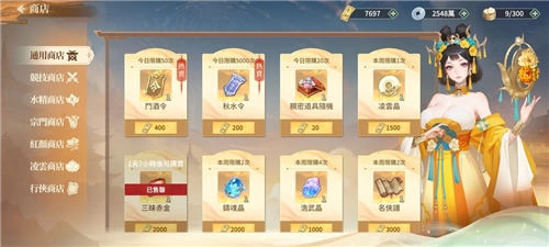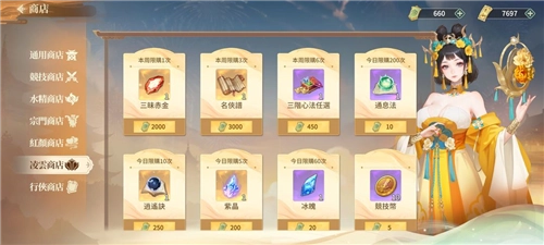 商店里的道具用处极大但不能全部买完,应适当购买最有用的道具以节省货币;通用商店全部需金券购买,前期只推荐买少量招募令,凌云晶、三昧赤金、昊武晶与名侠谱前期不买后期酌情购买;竞技商店一周刷新一次,传说碎片与阵法碎片必买,蓝紫碎片前期开图鉴可酌情购买后期不用,火精、阳炎、兵书、点阵图每日刷新,在不影响购买传说碎片与阵法碎片的情况下酌情购买;水精商店看阵容配饰的武器选择购买,且商店没有藏锋碎片,藏锋碎片只能通过氪金及副本水精迷途获得,450金3碎且随机;宗门商店优先购买昊武晶与阵法碎片,元气、先天胎息、铁石乌金前期酌情购买,先天胎息可一直购买;红颜商店全买,金币永远溢出。