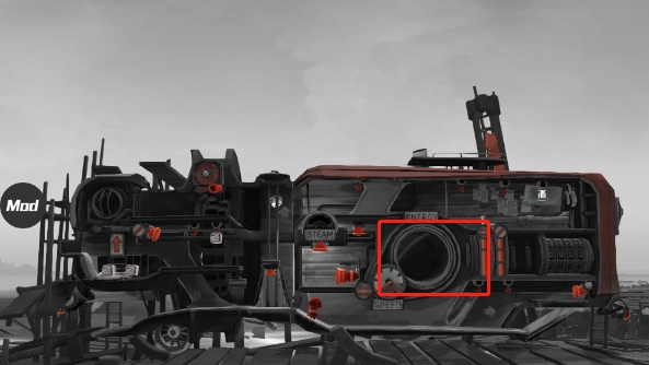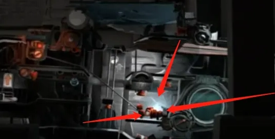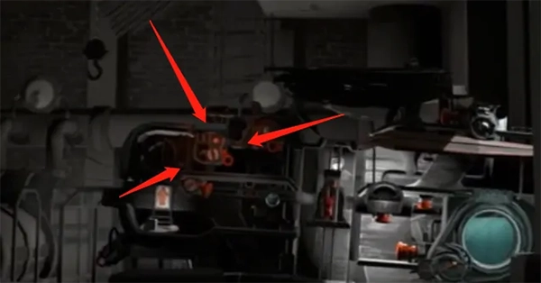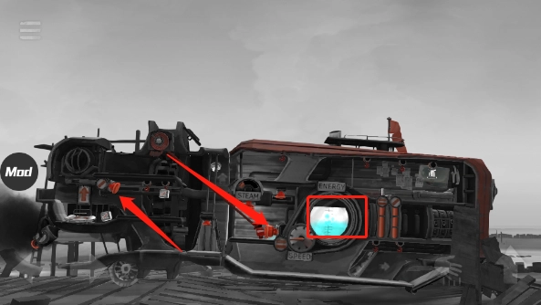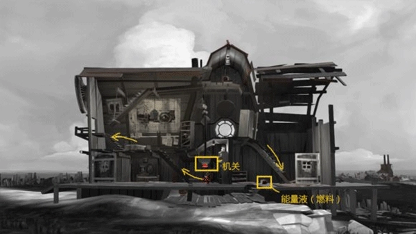 图里被重点标注的是机关,颜色为橙红色,所有图中的机关都是这个颜色。因为人只能控制前后移动和跳跃这几个动作,所以按钮的操作方式基本就是顶、踩、推这几种。能量液是用来驱动后面的“房车(帆车)”的。能量液不直接叫燃料,是因为之后它还能用来灭火,叫燃料的话会有些违和。