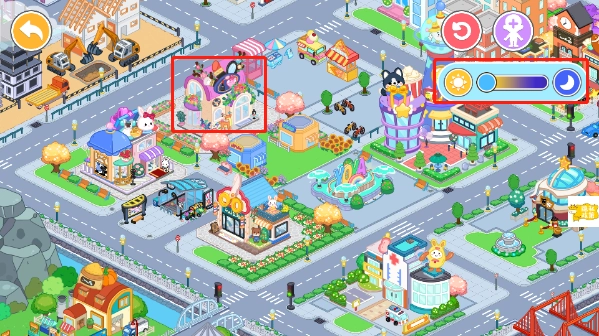 1、进入游戏后,我们可以通过右上方的滑轮来切换不同时间对应的风景,选择不同的建筑就能进入相应的场景。