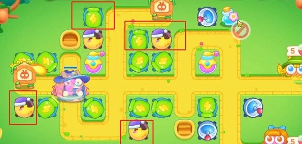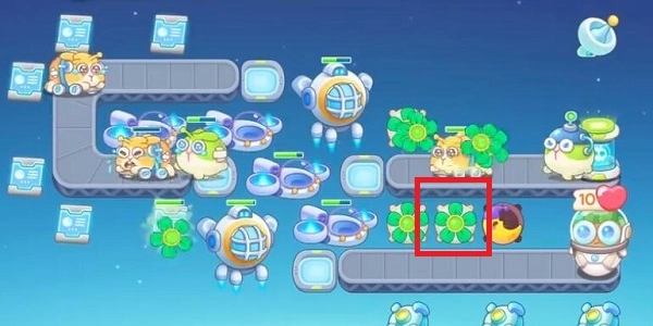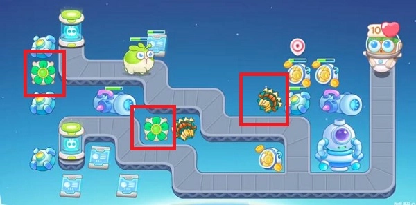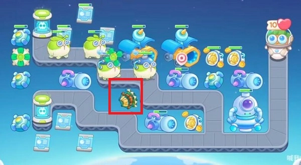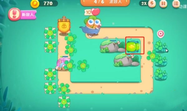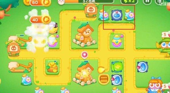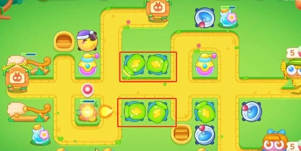1、首先打开保卫萝卜4正版安卓版,我们进入关卡以后,在如图所示的红框位置放置1个分裂炮台,这样我们攻击怪的时候同时也可以攻击其他建筑物。