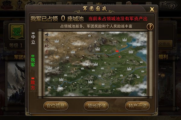4. 每占领一座都城,军团可授予成员九个官职,并领取元宝俸禄。