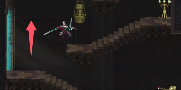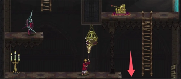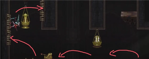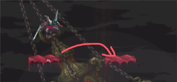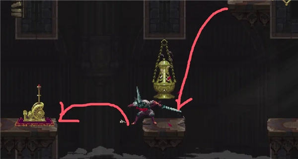 ②跳到香炉下面的平台上,然后跳去左边,开启回存档点的捷径。如果血量不够就回去存个档,但还是要回到捷径这里。