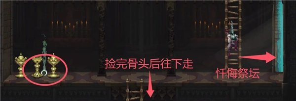 在一堆圣杯当中捡到妓女琼恩的髋骨。髋骨这层右边的门是去忏悔祭坛。如果需要捡尸就去一下。之后沿着梯子往下走。