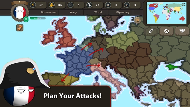 1、外交与征服 向其他国家宣战或缔结同盟。签订和平条约,发出同盟请求,甚至通过操控实力被削弱的国家来拓展自身影响力。请明智地挑选盟友——因为对手会伺机夺取您的领土,全力击败您的国家!
