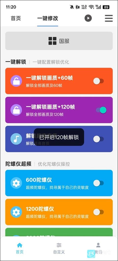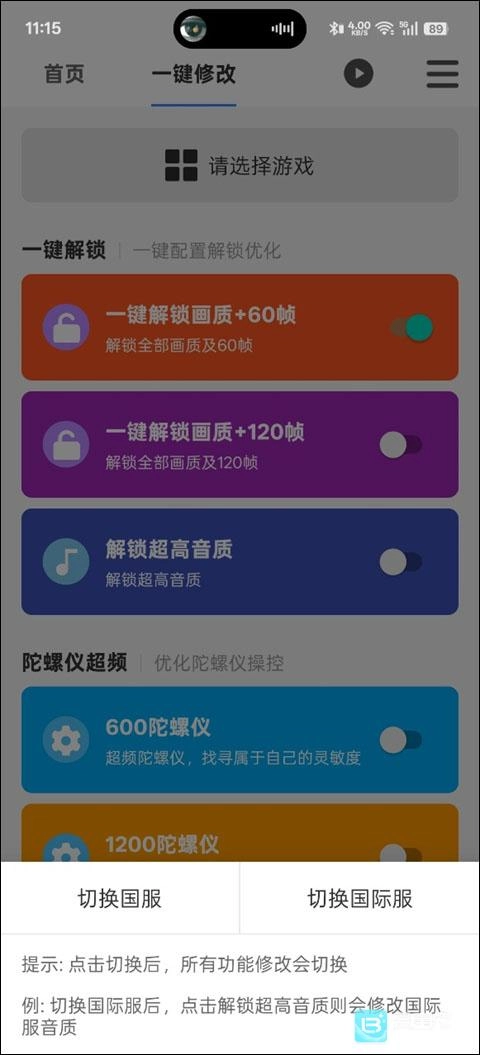 软件首页提供一键修改和DIY修改功能,一键修改可选择国际服或国服并启动一键解锁画质+120帧率,DIY修改可自由选择参数调整。