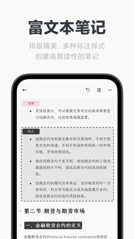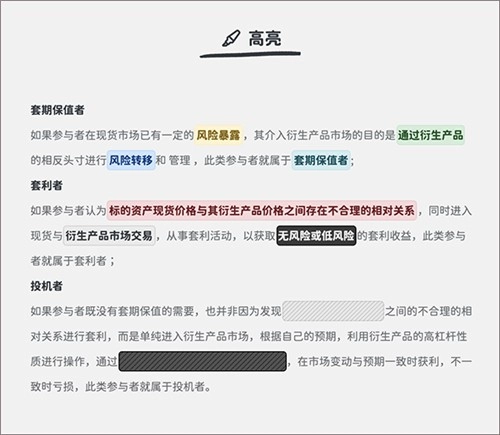 框选部分段落设置外框并编辑外框标题可清晰标注段落总结,提供七种外框颜色供不同标记使用;支持七种高亮颜色标记笔记重点,两种挖空颜色隐藏内容便于背诵阅读;针对标题、列表段落可点击段落前按钮折叠或展开,还有备注、注解、大纲等功能。