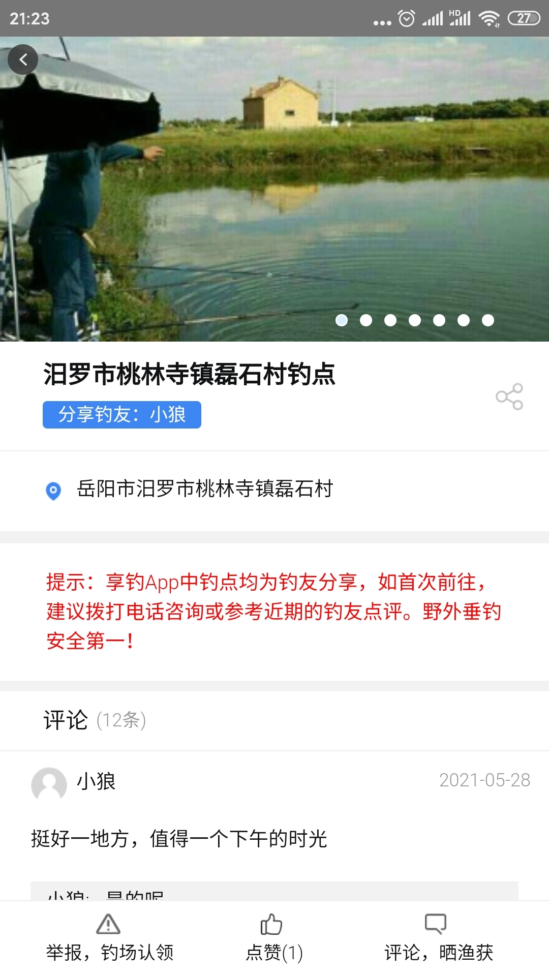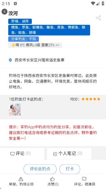 3、点击目标钓点进入详情页,查看鱼种、天气、地址等信息并进行打卡、评论。
