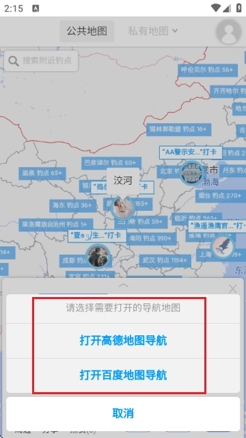 4、在地图界面点击钓点后选择“打开高德地图导航”或“打开百度地图导航”启动导航。