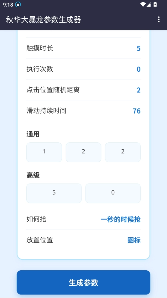 -快速生成参数:打开秋华大暴龙参数生成器App后,先选择游戏、抢购或挂机等场景模板;接着通过悬浮窗功能点选目标位置,再设置好点击间隔与次数,最后一键生成参数,全程无需手动输入坐标。