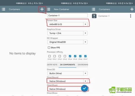 2、在导入游戏前,我们需要先创建一个容器。具体操作是通过首页点击“+”来创建,接着进行选项设置。这里的设置需根据要导入的游戏来调整,比如分辨率大小、Direct sound 和 Direct Music等参数,以确保导入游戏后画面尺寸正常、背景音乐能流畅播放。