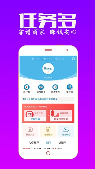 多任务通过每天提供巨额奖励帮助用户赚钱,无门槛提款支持1元提现且赏金由民帮发放无拖欠诈骗,还有红包、赏金券、创意赚钱方式等大量活动带来乐趣和金钱。