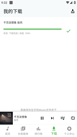 点击按钮即可保存歌曲至Music文件夹方便文件管理,不同榜单每周固定时间更新可第一时间听到热门新歌,分类歌单覆盖工作、休闲、助眠等场景能一键切换听歌氛围。