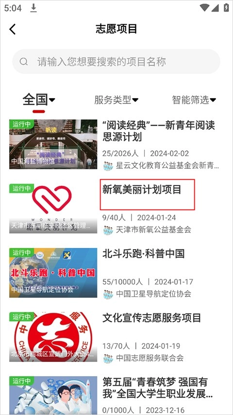 1. 项目搜索:查找近期的志愿者项目,并随时报名参与志愿服务。