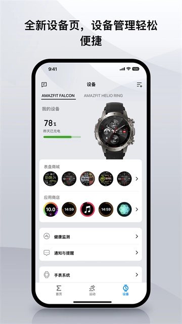 Zepp和Amazfit品牌的智能设备管理配置功能提供通知管理、表盘交换、小程序排序等,支持离线同步功能,即使断开网络也能不遗漏地继续记录身体数据变化,记录步数、睡眠、心率、消耗、心电、血氧等身体状态数据且随时可查看专业解读。