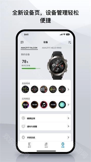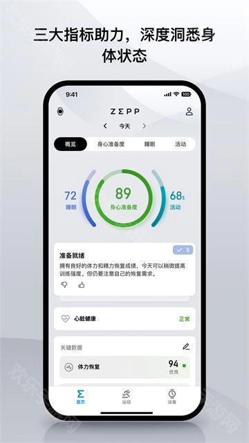 支持心率、血氧、睡眠等多项生理指标监测并记录步数等10+项生理指标,支持AI分析生成健康报告,支持记录运动后数据展示及详细轨迹和运动数据指标分析,兼容Amazfit、Zepp品牌手表/手环,支持更换表盘、设定闹钟及同步通知。