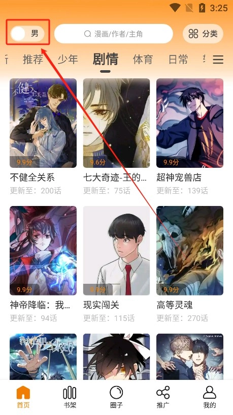 1、打开软件后,在首页左上角可快速切换男频或女频分类,方便根据阅读偏好筛选内容。