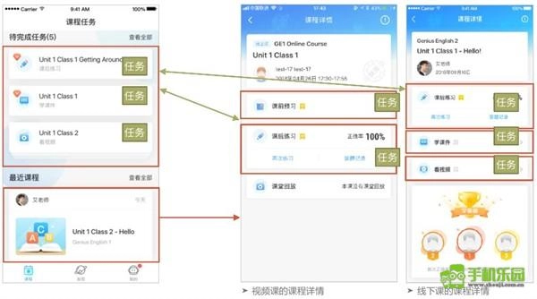 1、“待完成任务”板块展示所有未完成的任务内容,涵盖视频课对应的课前预习与课后练习,以及线下课相关的课后练习、学习课件和观看视频。