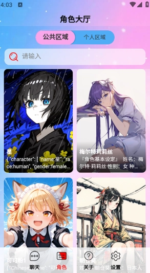 提供十多种预设AI角色,风格覆盖动漫、都市、古代等,并且支持自定义创建以及导入角色卡,能够自由设定角色的性格、外貌和背景。