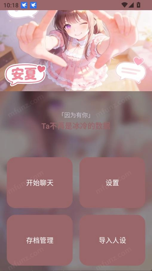 1、打开安夏Ai ,主界面有开始聊天、设置、存档管理、导入人设四个按钮。