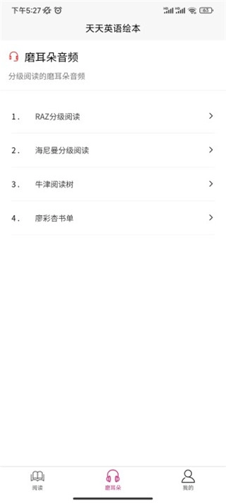 3、除了能够阅读外,你还可以进入磨耳朵环节,听各种分级阅读的音频;