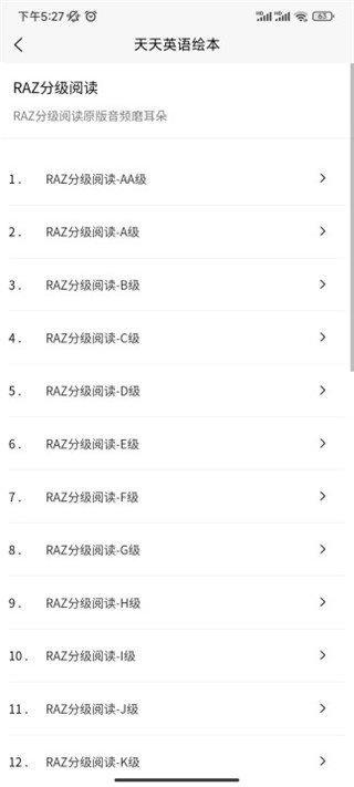 1、进入天天英语绘本,软件提供了Raz分级阅读、海尼曼分级阅读、牛津树分级阅读、兰登分级阅读等等;